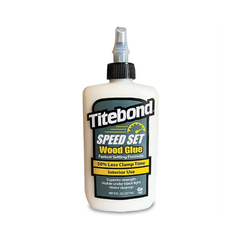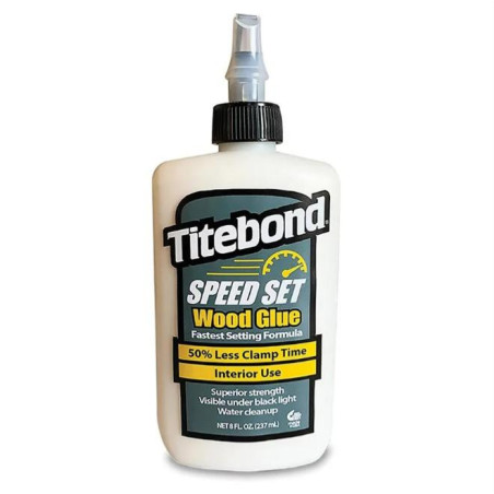 Titebond Speed Set Wood Glue est un adhésif PVA à haute teneur en solides extrêmement rapide. Ce produit se ponce facilement, et augmente la productivité grâce à son temps de serrage plus court sans augmentation de viscosité. Il offre des propriétés exceptionnelles de comblement des vides développant un lien plus fort que le bois lui-même. Titebond Speed Set est non toxique et se nettoie avec de leau. La visibilité sous la lumière noire vous permet dinspecter les lignes de colle et de simplifier le nettoyage. Ne doit pas être utilisé à lextérieur ou lorsque lhumidité est probable. Cette colle ne doit pas être utilisé pour des applications structurales ou portantes.