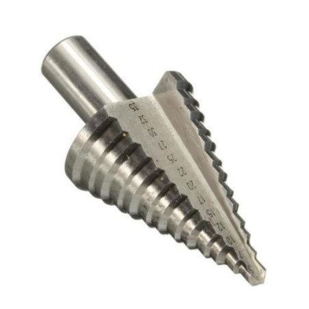 Foret étagé HSS à goujure droite. Diamètre 6 à 38mm. Idéal pour le perçage du bois, des tôles en acier, du laiton, du PVC, de l'aluminium, de l'acier et des thermoplastiques. Le tranchant des forets élimine le bourrage et les vibrations. Il permet de faire des trous parfaitement ronds et nets. Le trou est ébarbé par le chanfrein du diamètre suivant.