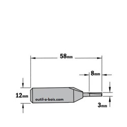 Cette fraise de défonceuse CMT a un diamètre de 3 mm, une queue de 12 mm ,une longueur utile de 8 mm et une longueur totale de 58 mm.