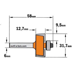 - Diamètre 31,7 mm - Profondeur de la feuillure (H) 9,5 mm - Longueur de coupe (I) 12,7 mm - Longueur totale 54,8 mm - Diamètre du roulement 12,7 mm - Queue de 6 mm