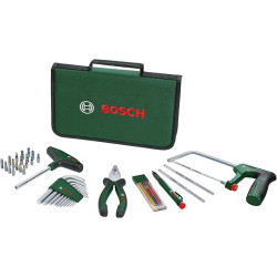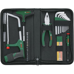 Il contient tournevis à embouts poignée en T, pince combinée 180 mm, scie 150 mm, crayon de marquage , 10x clés à six pans creux, 18x embouts, 2x lames de scie à repasser, 6x mines multicolores dans une poche en tissu avec fermeture à glissière.