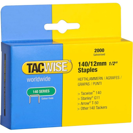• Compatible avec les agrafeuses Tacwise Z1-140, Z1-140L, Z3-140, Z3-140L, A11, A54, 140EL, 140-180EL et A14014V ainsi que les agrafeuses Stanley, Rapid, Arrow et d’autres qui acceptent les agrafes de type 140 (veuillez toujours vérifier la compatibilité avec votre outil avant d’acheter)