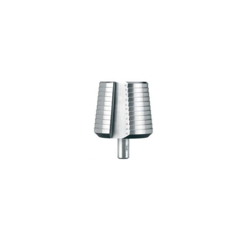 Foret étagé, foret conique HSS à goujure droite. Diamètre 50 à 60mm. Idéal pour le perçage du bois, des tôles en acier, du laiton, du PVC, de l'aluminium, de l'acier et des thermoplastiques. Le tranchant des forets élimine le bourrage et les vibrations. Il permet de faire des trous parfaitement ronds et nets. Le trou est ébarbé par le chanfrein du diamètre suivant.
