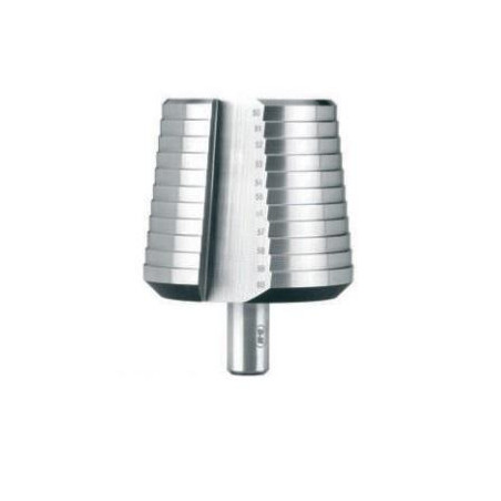 - Diamètre (D) 50 à 60 mm - Longueur totale (LT) 85 mm - 11 étages (50-51-52-53-54-55-56-57-58-59-60) - Queue de 13 mm (d) - Outil en acier HSS - Goujure droite - Outil de haute qualité