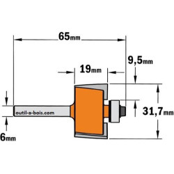 - Diamètre 31,7 mm - Profondeur de la feuillure (H) 9,5 mm - Longueur de coupe (I) 19 mm - Longueur totale 64,8 mm - Diamètre de roulement 12,7 mm - Queue de 6 mm