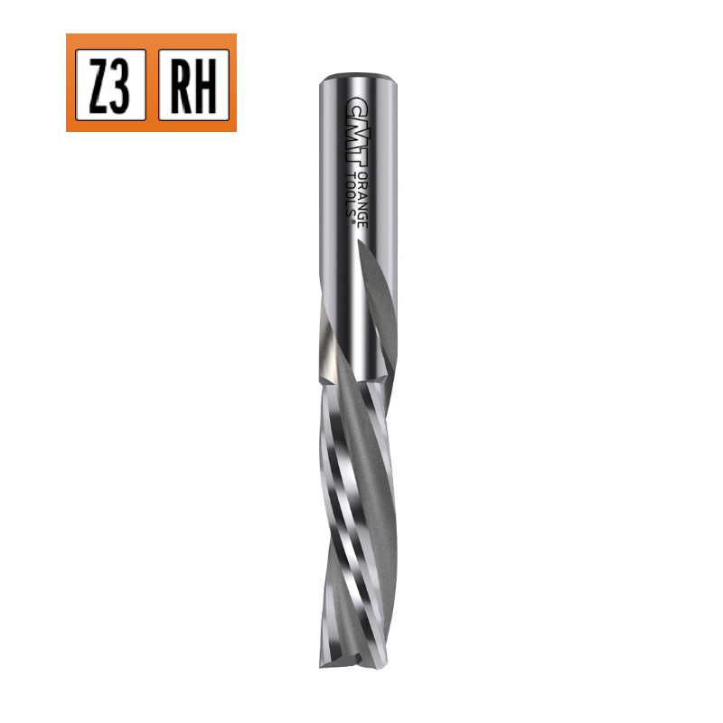Hélice négative (downcut) : évite les éclats en surface, finition premium.