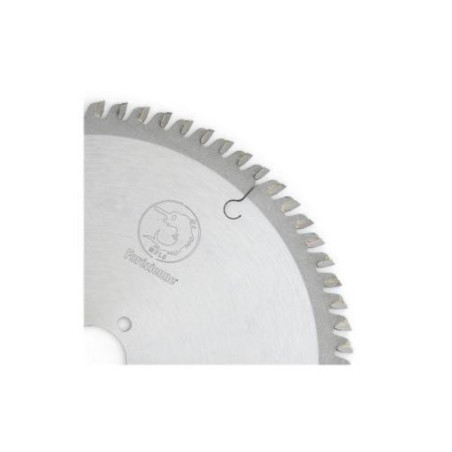 Lame de scie circulaire carbure pour le débit et la mise à format de panneaux. Angle de coupe négatif pour mieux plaquer le bois sur la table de travail.