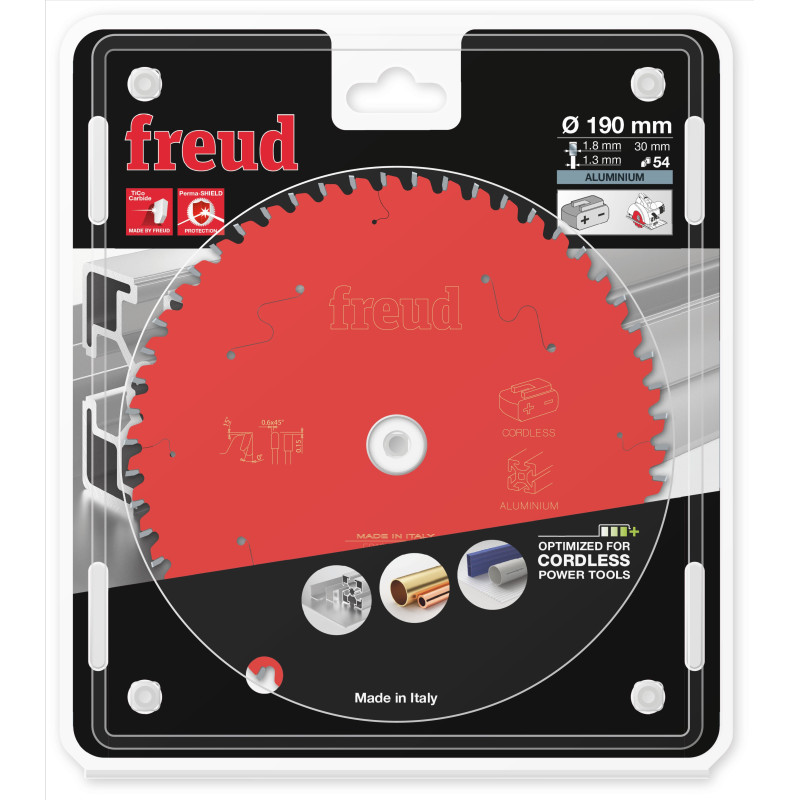 Lame circulaire avec angle d'attaque négatif pour le sciage de l'aluminium. Les lames FREUD sont revêtues d'une protection anti-corrosion qui les maintiennent à basse température pendant leur utilisation. L'action antiadhérente améliore l'éjection des copeaux et réduit l'accumulation de résine.