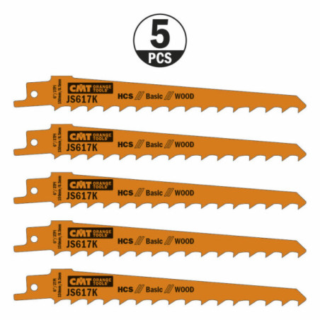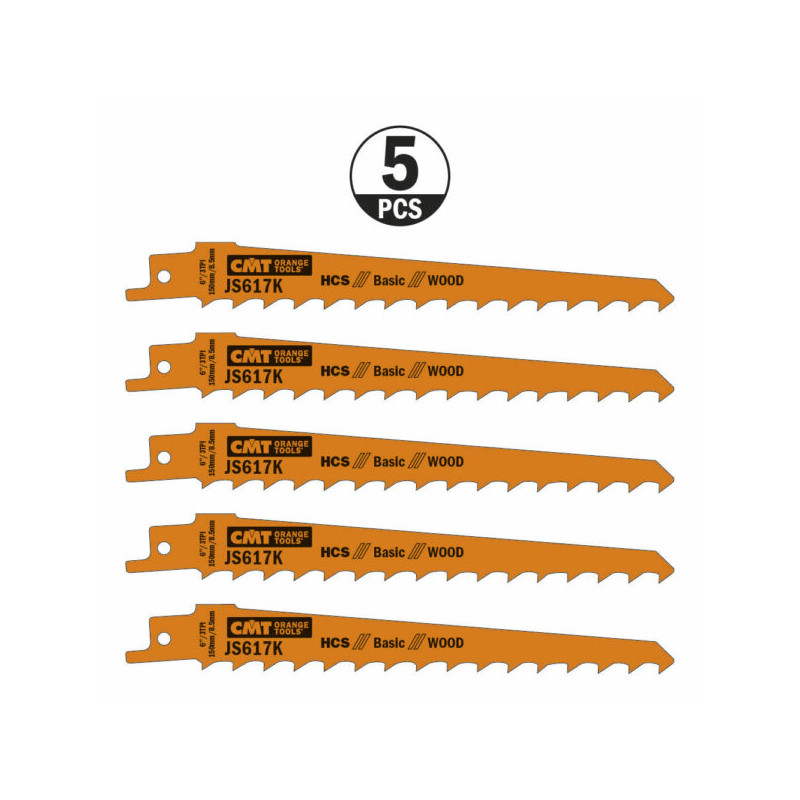 Lot de 5 lames de scie sabre pour la coupe de bois grossière, sans clous de moins de 100mm d'épaisseur, pour l'élagage de bois vert de moins de 100mm de diamètre. Spécial pour la coupe courbe et plongeante.