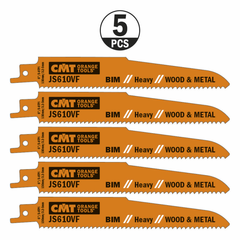 Lot de 5 lames de scie sabre pour la coupe du bois avec clous ou métal, aggloméré, plastiques renforcés de fibres de verre et époxy, tranches de mur en bois ou métal, tous de moins de 100mm d'épaisseur. Pour les travaux de démolition et recyclage.