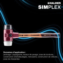 Le maillet Halder SIMPLEX 3027.080 combine deux types d’inserts (embouts) : un embout en caoutchouc chargé noir (moyennement dur, amortissant) et un embout en superplastique blanc (moyennement dur, très résistant). Ce design permet d’adapter la frappe selon les besoins : le caoutchouc pour des impacts doux, le superplastique pour des frappes plus puissantes. Il bénéficie d’un boîtier en fonte malléable très résistant et d’un manche en bois ergonomique et amortissant. Tous les composants sont interchangeables grâce à la conception Simplex, ce qui prolonge la durée de vie de l’outil.