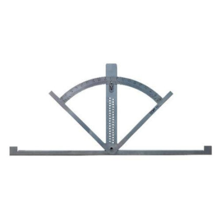 Rapporteur double pour travaux de charpente. Longue arête de butée et double échelle graduée.