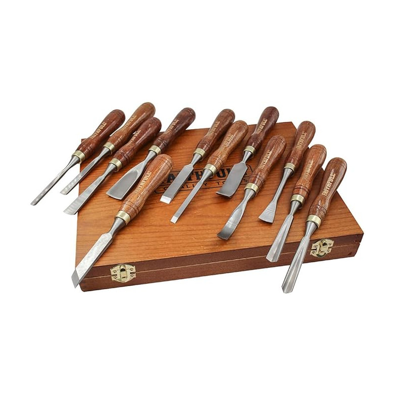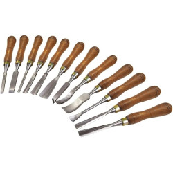 Assortiment d'outils idéal pour les travaux de sculpture sur bois les plus courants. Lames en acier forgé finement poli. Manches en bois verni avec virole laiton. Coffret bois verni.