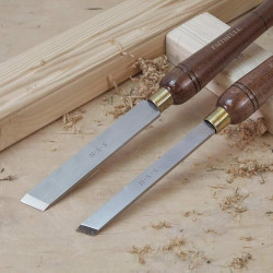 Lames en acier HSS. Manche 250 mm en noyer verni avec virole laiton. Longueur totale : 410 mm. Longueur lame 160 mm. Coffret bois verni.
