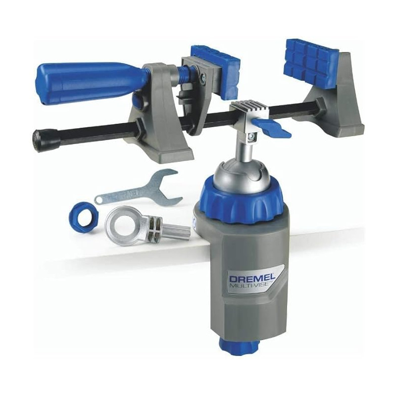 Le Multi-Vise Dremel est une adaptation 3 en 1 complète pour votre outil multi-usage Dremel. Le Multi-Vise permet de maintenir une pièce dans n’importe quelle position et de travailler sous n’importe quel angle grâce à sa base orientable sur 360° facile à ajuster et à sa fonction d’inclinaison jusqu’à 50°. Le serre-joint de la base est revêtu d’un matériau tendre pour ne pas laisser de traces ou de rayures sur votre établi ou table de cuisine. Fixez le Multi-Vise sur votre établi et utilisez-le comme support machine stationnaire pour amener la pièce devant votre outil multi-usage afin de réaliser des ponçages, polissages parfaitement maîtrisés. Vous pouvez aussi retirer le serre-joint facilement et l’utiliser séparément pour fixer la pièce directement sur votre établi. Grâce à la fonction de desserrage rapide, vous pouvez libérer la pièce rapidement par simple pression sur un bouton pour passer à la prochaine étape de votre projet. Les mâchoires du serre-joint sont dotées de pads en caoutchouc amovibles et de rainures en V améliorant le maintien et la protection de la pièce et évitant que le serre-joint laisse des traces lors du serrage.