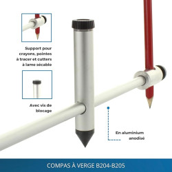 • AVEC PORTE-CRAYON - Le grand compas dispose d'un support pratique avec vis de serrage pour crayons, pointes à tracer et cutters à lame sécable.