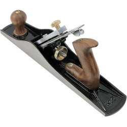 Rabot avec corps en fonte d'acier. Semelle rectifiée sur 3 faces. Poignées avant et arrière en bois vernis. Vis de réglage et de serrage du fer en laiton. Réglage de la profondeur de coupe. Réglage de la lumière pour limiter les éclats, levier de gauchissement pour ajuster l'angle latéral. Angle de coupe 45°