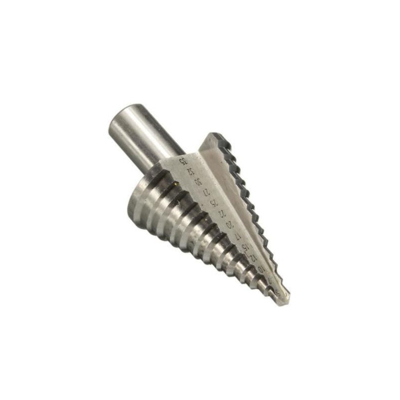 Foret étagé HSS à goujure droite. Diamètre 6 à 40mm. Idéal pour le perçage du bois, des tôles en acier, du laiton, du PVC, de l'aluminium, de l'acier et des thermoplastiques. Le tranchant des forets élimine le bourrage et les vibrations. Il permet de faire des trous parfaitement ronds et nets. Le trou est ébarbé par le chanfrein du diamètre suivant.