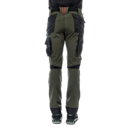 Poche latérale porte-outils, poche latérale multifonction avec porte badge rétractable, deux poches à larrière dont une avec patte et une avec fermeture Velcro.