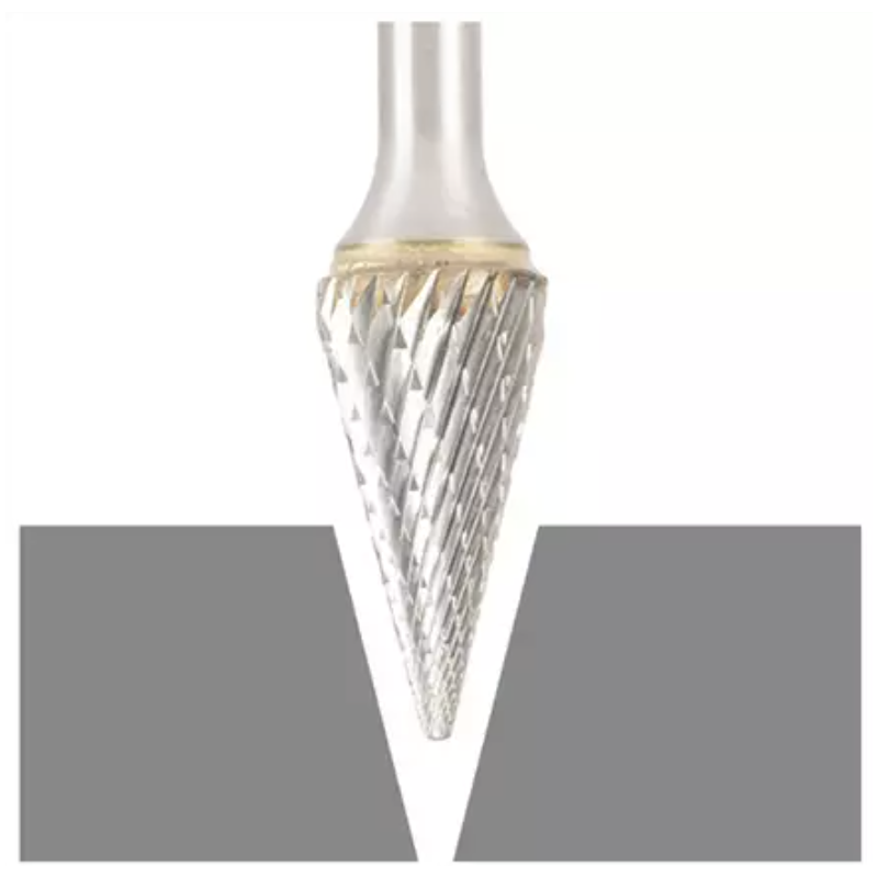 Cette lime rotative au carbure de tungstene est conique à bout pointu. Elle convient pour l'ébavurage des matériaux suivants : Laiton, cuivre, fonte, bronze, titane, aciers.