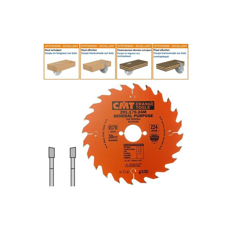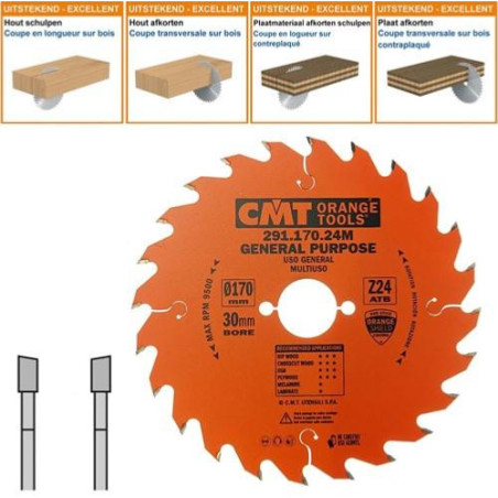 Lame circulaire CMT pour coupes transversales pour portatives - Diamètre 170mm - Alésage 30mm - 24 dents alternées - Ep 2,6/1,6 - CMT Orange tools