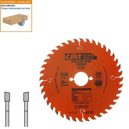 Lame circulaire CMT pour coupes transversales pour portatives - Diamètre 180mm - Alésage 30mm - 40 dents alternées - Ep 2,6/1,6 - CMT Orange tools